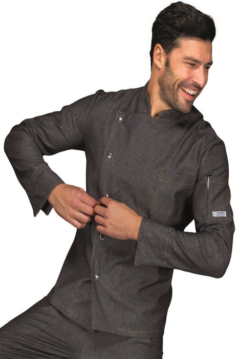La Giacca Cuoco Belfast Black Jeans slim unisex di Isacco è progettata per garantire comfort e funzionalità in cucina. Realizzata in 100% poliestere a manica lunga e 100% cotone a manica corta, offre traspirabilità grazie al Microfor. Presenta una pratica allacciatura asimmetrica con bottoni a pressione e taschini sul petto e sulla manica, ideali per riporre piccoli strumenti. Perfetta come divisa professionale per chef in ristoranti, catering o ambienti di cucina impegnativi, unisce stile e praticità.