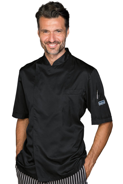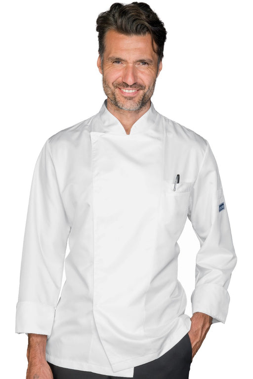 La giacca da cuoco Helsinki unisex, disponibile in bianco o nero, è progettata per garantire comfort e funzionalità in cucina. Realizzata in 100% poliestere Superdry, assicura resistenza e traspirabilità grazie alla rete posizionata ai fianchi. Il design slim con maniche lunghe o corte offre una vestibilità moderna, mentre i bottoni a pressione nascosti permettono una chiusura pratica e ordinata. Dotata di taschini al petto e sulla manica, è ideale per chef professionisti in ristoranti, cucine e catering.
