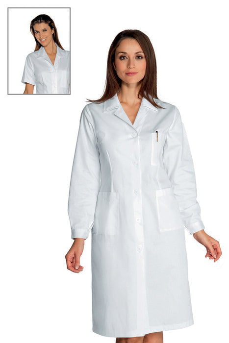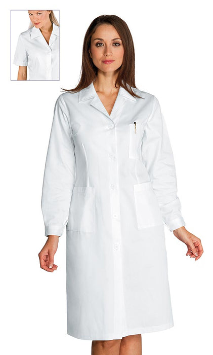 Camice Medico Donna Bianco Satinato No Stiro è in tessuto raso non stiro qualità superiore. Cotone lunga fibra doppio ritorto per dare resistenza e la massima durata nel tempo.