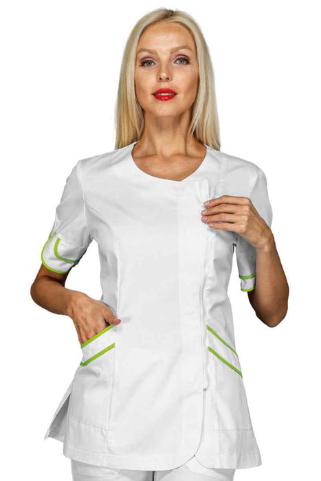 Casacca dalla linea slim sfiancata elegantissima con delle caratteristiche che la rendono unica. Apertura centrale invisibile con apertura bottoni a pressione. La linea si stringe in vita e si allarga seguendo i fianchi con degli spacchetti alle estremità. E' lunga oltre i fianchi. Dotata anche di 2 comode tasche laterali. E' una casacca dai lineamenti di una camicetta. Raffinata per tutti gli ambienti lavorativi dove deve essere risaltata l'eleganza. Ideale anche per le reception.