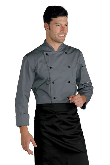 - Giacca Cuoco Grigio - Modello classico unisex, 65% poliestere e 35% cotone, design elegante e sobrio