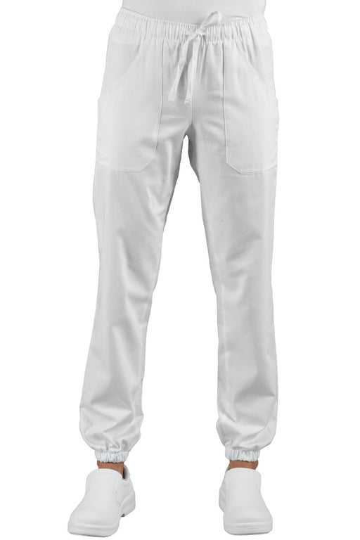Pantalone con laccio in vita ed elastico alle caviglie in tecnostretch bianco uomo donna Isacco, In tessuto traspirante e resistente assicura freschezza e comodità per tutta la giornata. Molto utilizzato anche nel ambito medicale, estetico, sanitario, ospedaliero e alimentare e come divisa da lavoro medico, infermiere, per aziende di servizi, pulizie e cucina e cuoco.